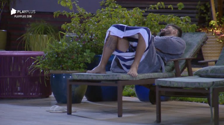 Pensativo. Assim está o publicitário Diego Grossi. Depois de curtir um banho de ofurô, o peão se deitou em uma das espreguiçadeira à beira da piscina e lá ficou. De um total de 16 participantes, restam apenas 5. E hoje, segunda-feira (2), tem nova formação de Roça.