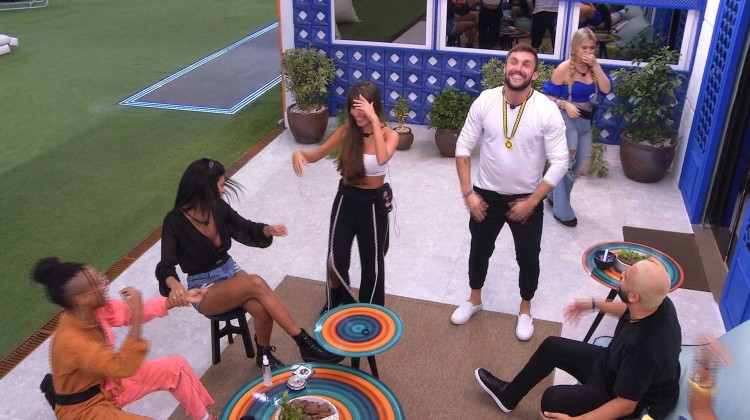 Os confinados se empolgam e soltam a voz no refrão. Depois do hit, o grupo segue cantando outras músicas do mesmo grupo.
