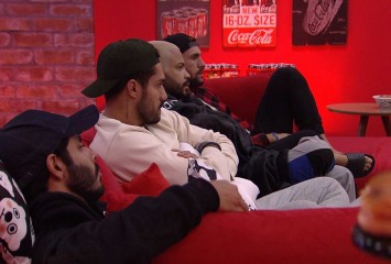 Arthur, Arcrebiano, Projota e Rodolffo estão reunidos na sala do BBB21 aguardando para subirem par...